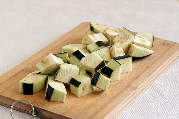 Баклажан очистить полосками. В некоторых странах их вообще никогда не очищают. Если баклажаны горчат, то проделать с ними обычную процедуру посыпания солью и затем промывания и обсушивания. У нас баклажаны не горчат и поэтому их нужно сразу же нарезать кусочками- брусочками, довольно толсто.