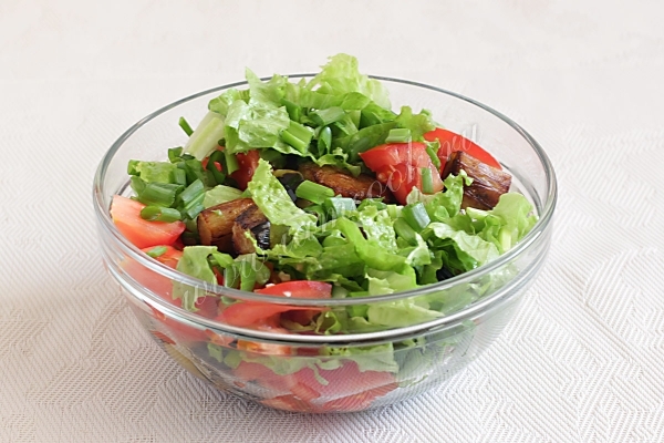 Нам потребуются всего лишь: один крупный баклажан, помидор, зеленый лук, салат, соевый соус, зубчик чеснока, масло для обжарки баклажан. Вообще, зелень можно брать любую по вкусу и возможностям.