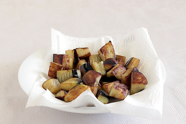 Быстро обжарить баклажаны в хорошо разогретом масле на сильном огне. Если огонь не делать сильным, то баклажаны успеют впитать много масла. Откинуть их на салфетку, чтобы ушел лишний жир.