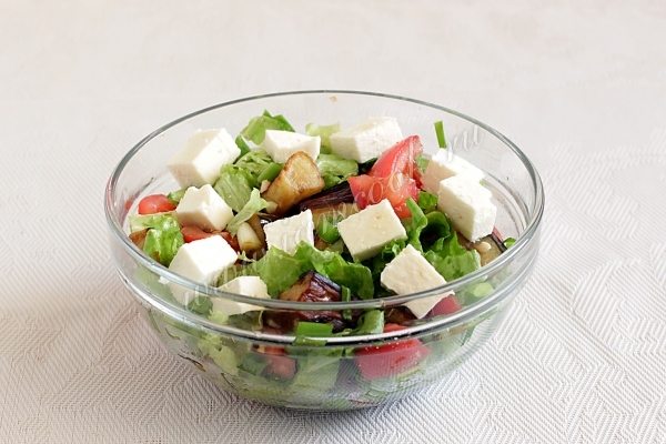 Сверху выложить кусочки сыра Фета. Аккуратно перемешать и сразу же подавать. Масло в салат уже не нужно добавлять.