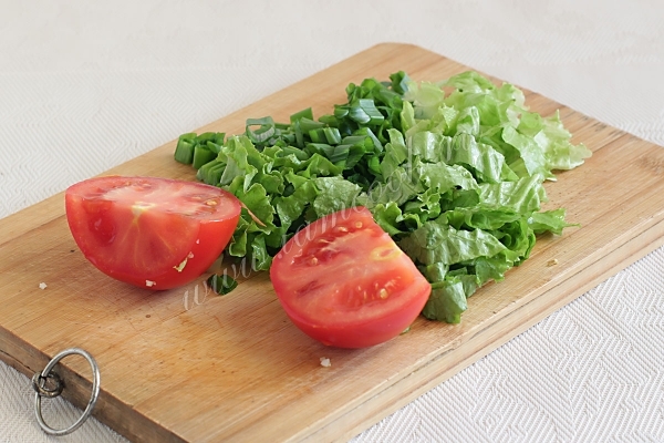 Зеленый лук и салат нарезать. Помидор так же нарезать дольками.