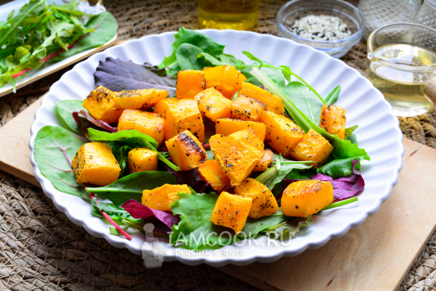 На тарелку выложите промытую и высушенную зелень - используйте любой микс. Сверху распределите теплую запеченную тыкву.