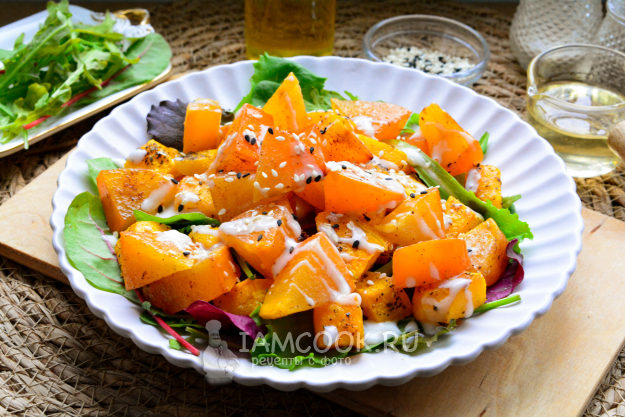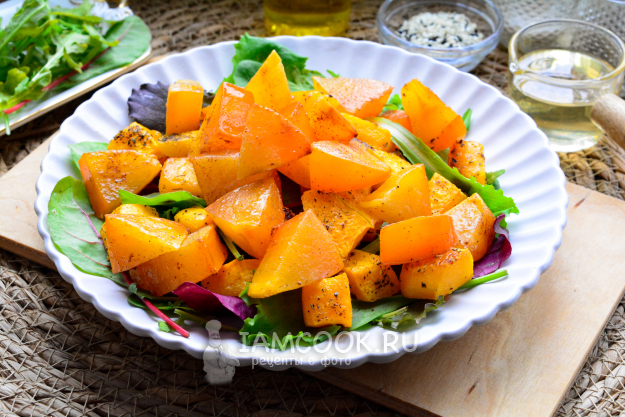 Готовый салат с тыквой и хурмой сразу подавайте к столу. Блюдо имеет оригинальный и насыщенный вкус.