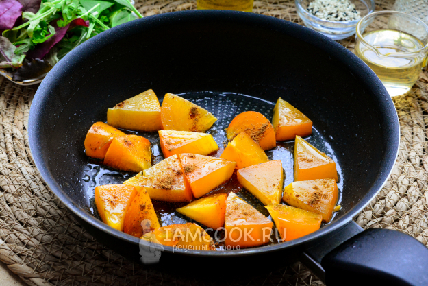Хурму для рецепта возьмите не слишком мягкую, сполосните ее и нарежьте средними кусочками. Растопите сливочное масло на сковороде, выложите туда хурму, добавьте немного молотой корицы для аромата и жарьте пару минут.