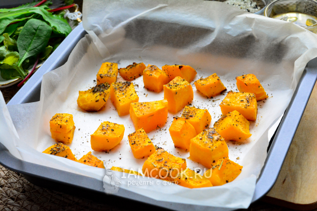 Запекайте тыкву в духовке примерно 20-25 минут при 190-200°С. Если любите овощи аль-денте, то сократите приготовление вдвое.