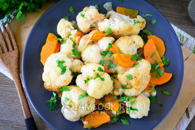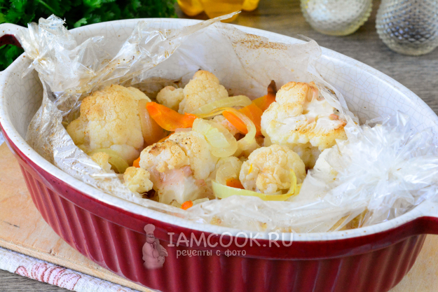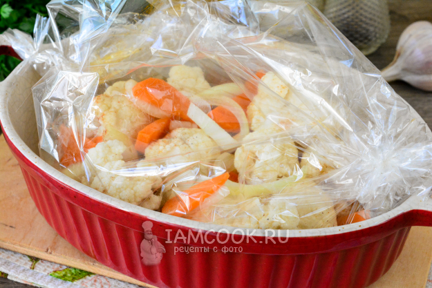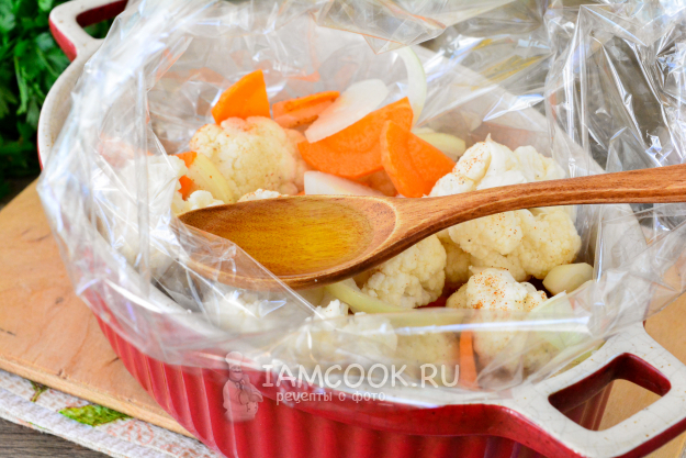 В рукав для запекания выложите цветную капусту с овощами, влейте туда немного растительного масла. Также можете влить пару ложек воды, чтобы капуста быстрее пропарилась и запеклась.