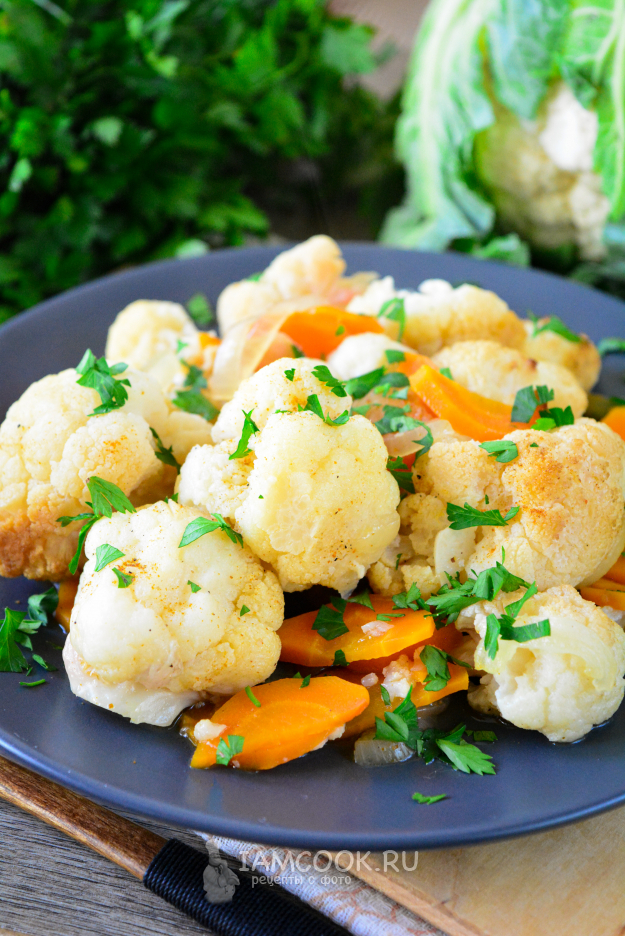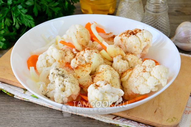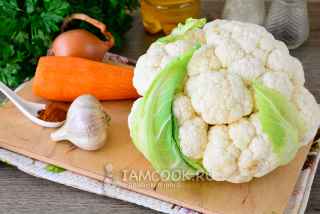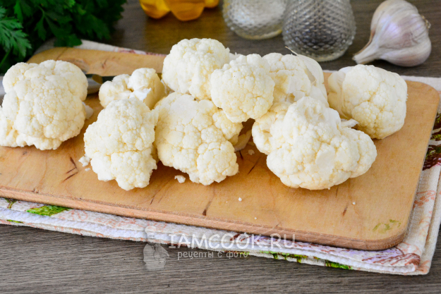 Цветную капусту сполосните и разделите на небольшие соцветия.
