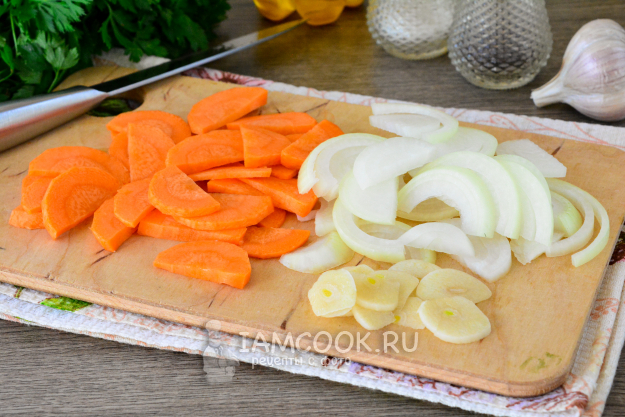 Овощи почистите и нарежьте. Лук и морковь нарежьте полукольцами, а чеснок - пластинами.
