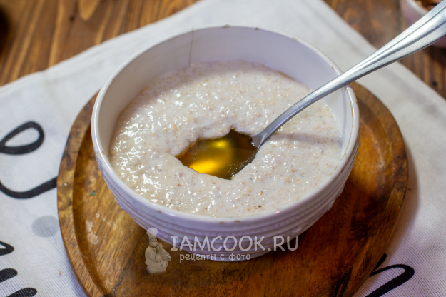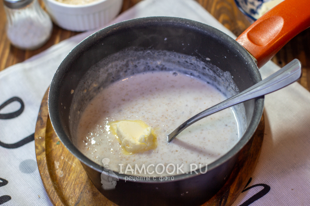 Снимите с плиты готовую кашу, добавьте сливочное масло. Сливочное масло можно заменить на топленое или кокосовое.