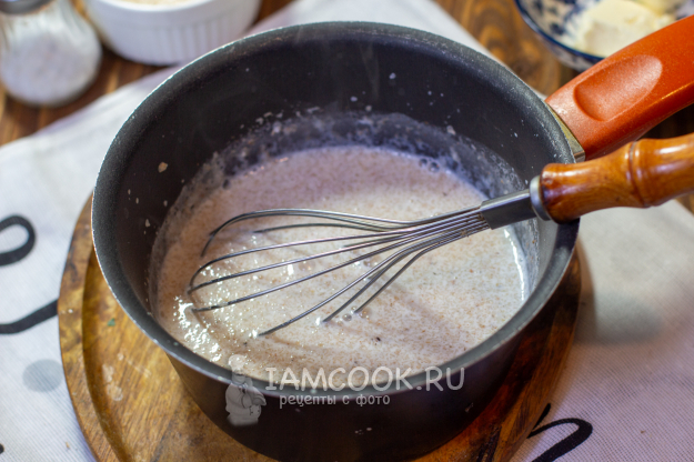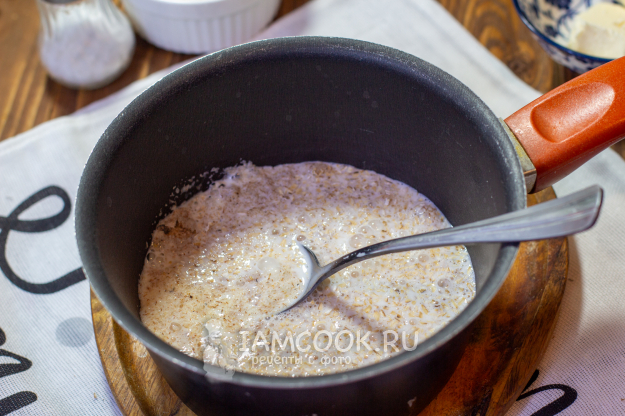 Поставьте на плиту, варите до кипения, помешивая ложкой или венчиком, после закипания проварите кашу не более 3-х минут.