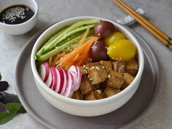 Равномерно полейте соусом лосося, морковь и зелень. Украсьте поке боул с лососем кунжутом или любыми семенами, и можно подавать к столу.