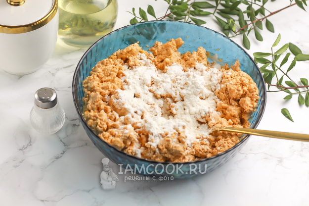 Всыпьте 2 ст.л. пшеничной муки высшего сорта и еще раз все тщательно перемешайте. Без муки сырная масса может развалиться при жарке.