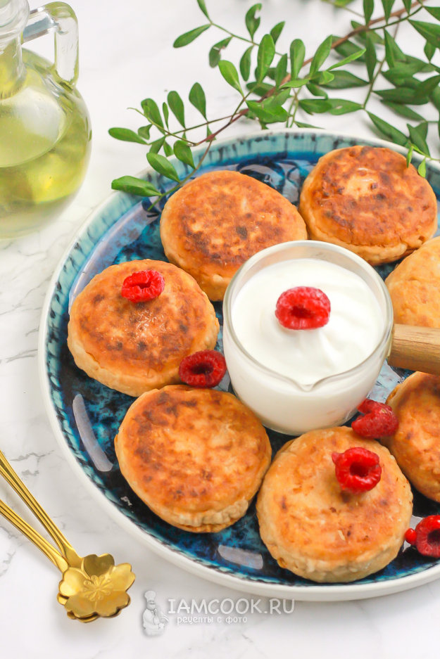 Выложите румяные карамельные сырники на тарелку и подайте к столу горячими со сметаной, ягодами, фруктами и любимыми напитками.