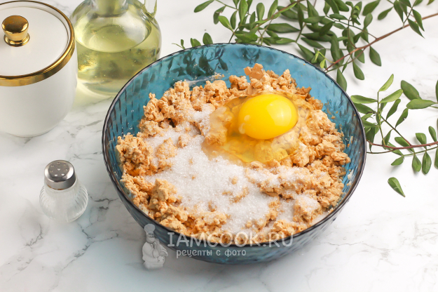 Выложите творог в миску или салатник и всыпьте туда же сахар, соль. Можно добавить пару щепоток ванильного сахара или молотой корицы. Вбейте куриное яйцо и тщательно перемешайте всю массу вилкой.