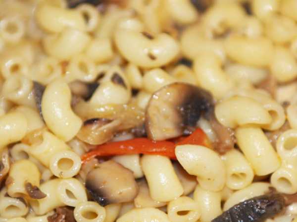 На другой сковороде на растительном масле обжарьте на сильном огне нарезанные тонко шампиньоны, лук, сладкий перец и давленый чеснок минуты три.