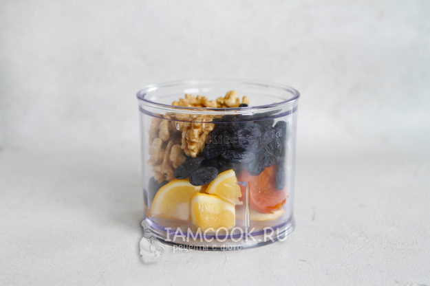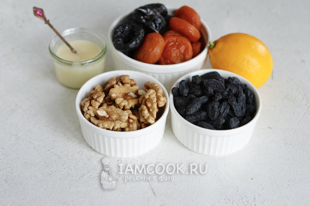 Соберите все продукты по списку и приступим к приготовлению витаминной смеси из сухофруктов.
