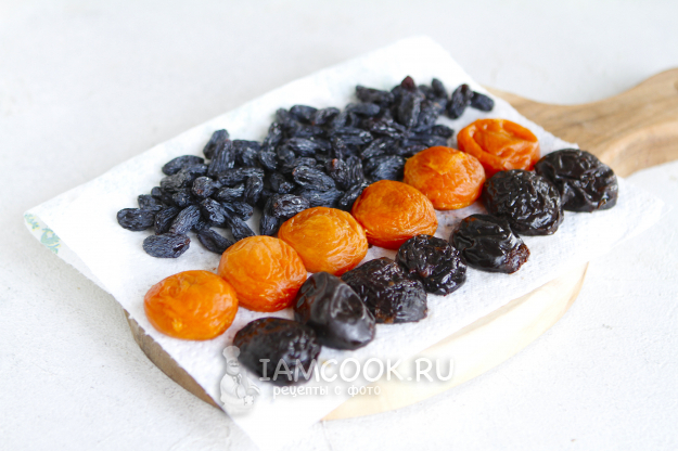 Слейте воду и обсушите сухофрукты бумажным полотенцем.