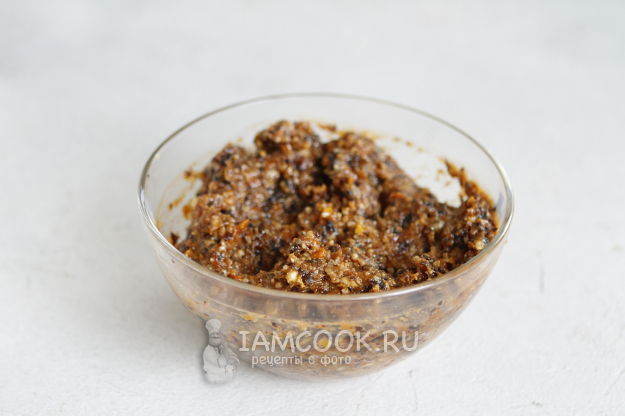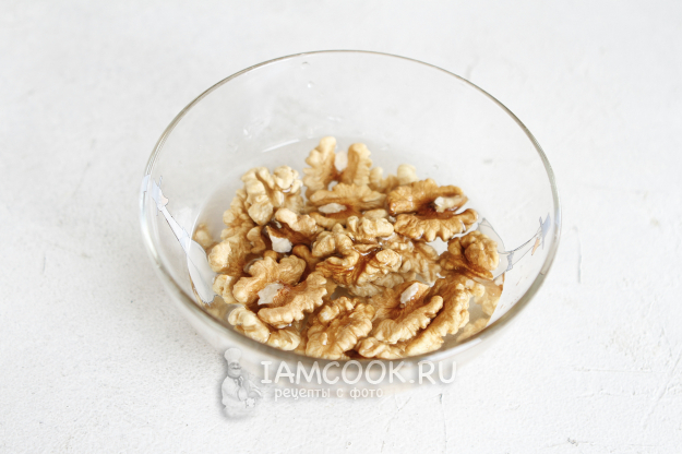 Грецкие орехи в идеале замочить на ночь в воде. Воду слить, а орехи слегка можно подсушить на сухой сковороде или в духовке.