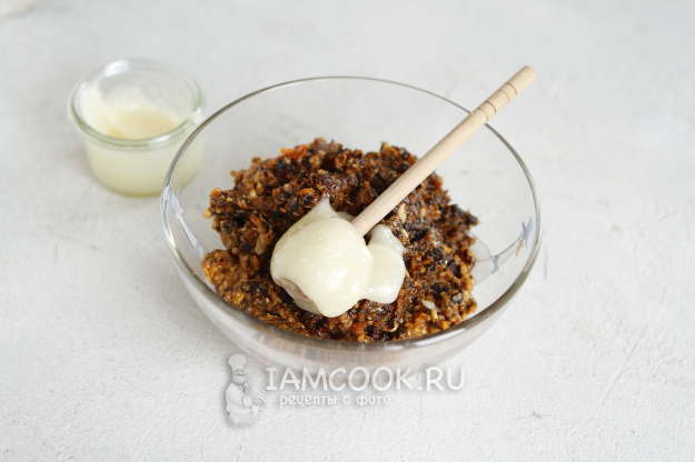 Полученную массу переложите в чашу, добавьте мёд и тщательно всё перемешайте. Масса получится густой. При желании густоту смеси можно отрегулировать под себя.