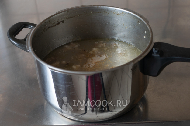 После закипания удалим пену, убавим огонь до минимума и поварим под крышкой 1 час с момента закипания.