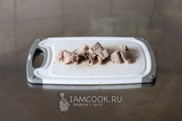 У языка удалим белую кожицу и порежем его на кусочки.
