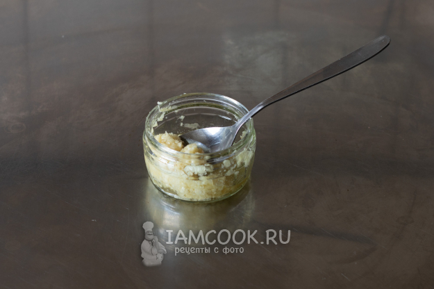 Смешаем измельченный чеснок с растительным маслом и оставим в стороне вплоть до сервировки (если рубить, то можно сделать это не заранее и без масла. Но оно вам надо - метаться непосредственно перед подачей? Лично я предпочитаю делать заранее всё, что только можно сделать заранее).