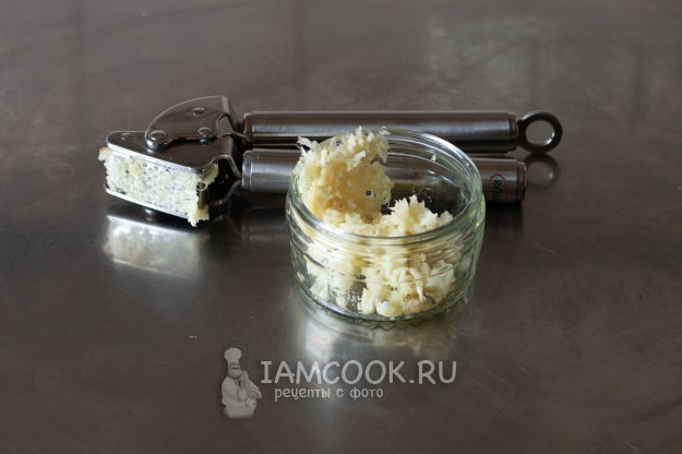 Пока варится бульон, оставшийся чеснок либо пропустим через пресс, либо мелко порубим ножом.