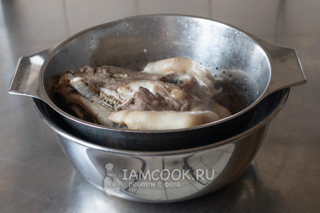После часа варки извлечём мясо из бульона. Если отрубы были такие, что там не может быть мелких фрагментов костей, то бульон просто используем дальше. Если отрубы с дроблёной костью, то сцеживаем бульон через сито или марлю, или аккуратно сливаем его через край в кастрюлю меньшего размера, чтобы тот осадок остался на дне.