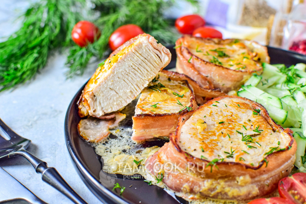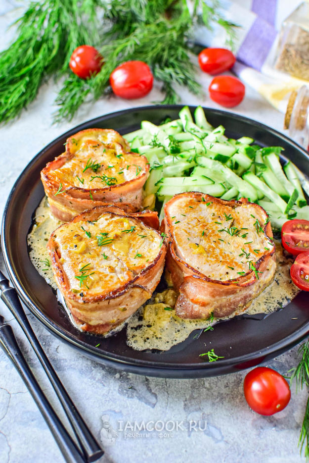Готовые медальоны из индейки в беконе разложите по тарелкам и дополните свежими овощами. Приятного аппетита!