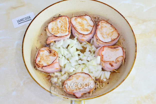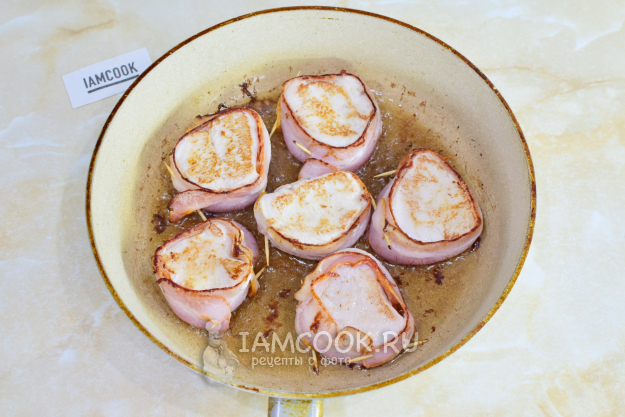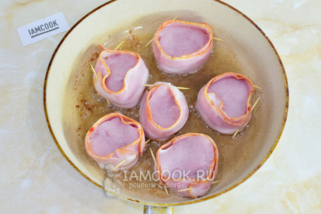 На горячую сковороду налейте немного растительного масла и выложите медальоны в беконе.