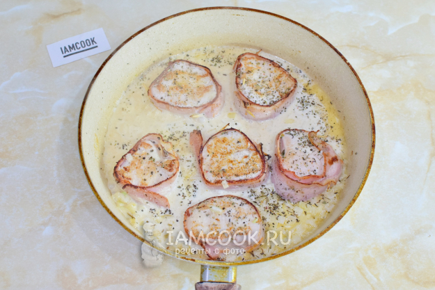 Затем влейте в сковороду горячую воду и сливки. По вкусу подсыпьте соль и специи. Пропустите через пресс чеснок. Накройте сковороду крышкой и тушите медальоны с беконом 10-12 минут на небольшом огне. Обязательно их переверните в процессе приготовления, чтобы они приготовились более равномерно.