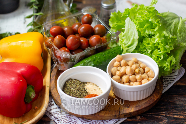 Соберите необходимые продукты для приготовления салата с запеченным нутом. Я взяла консервированный нут, но можно и самим отварить. Для того чтобы отварить нут, нужно его замочить на 6-8 часов, затем хорошо промыть, залить холодной водой и варить около 1 часа. Специи для запекания нута возьмите те, которые вам больше нравятся.