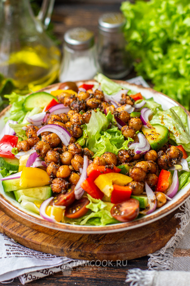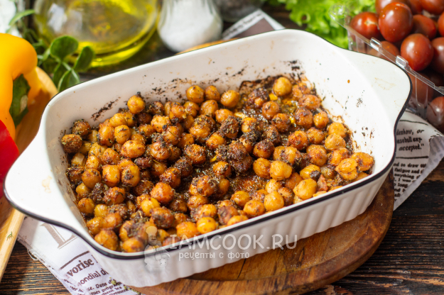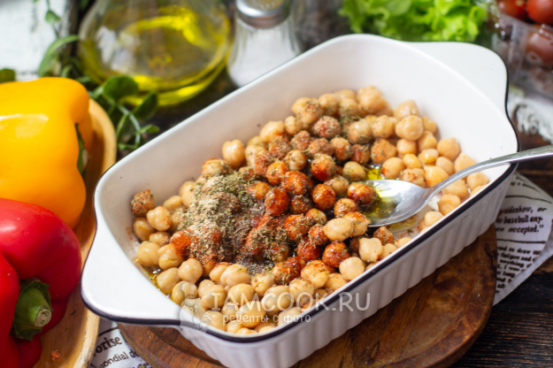 Запеченный нут получается румяным и хрустящим. В салат его можно положить как остывшим, так и теплым.
