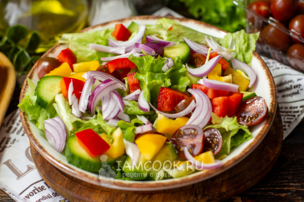 Красный лук нарежьте тонкими перьями, а сладкий болгарский перец - небольшими кусочками. Болгарский перец желательно взять разных цветов - так салат будет смотреться более ярко и нарядно. Распределите нарезанные овощи на тарелке с салатом.
