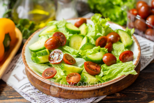 Для салата в тарелку порвите немного листьев салата, добавьте нарезанные пополам помидорки черри и свежий огурец, нарезанный кусочками.