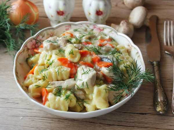 Из кастрюли выложите ньокки в сковороду с соусом из курицы и грибов, перемешайте все ингредиенты.