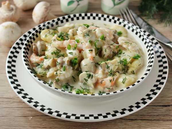 Чтобы приготовить ньокки с курицей и грибами, соберите ингредиенты по списку.