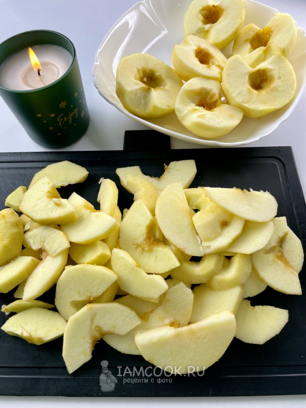 Очищаем яблоки от кожуры и убираем сердцевину. Нарезаем яблоки ломтиками.