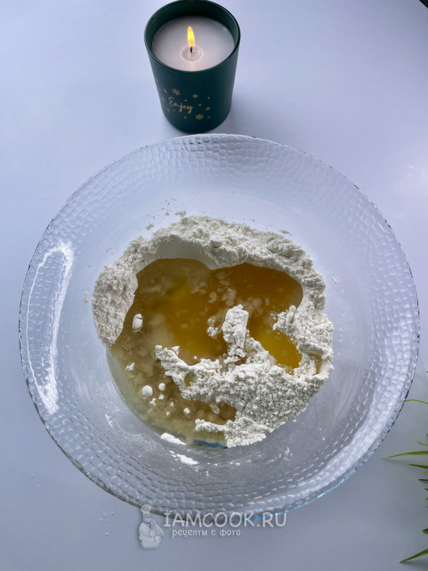 Смешиваем муку и крахмал. Добавляем 100 грамм растительного масла и сироп топинамбура.