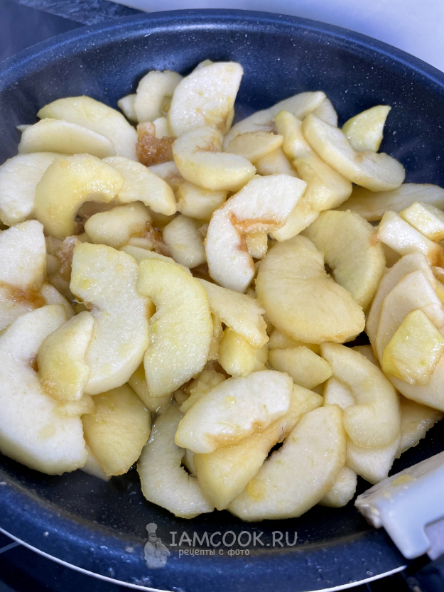 Как только сахар начнет таять, кладем яблоки. Добавляем немного воды и хорошенько перемешиваем. Тушим на медленном огне 10 минут.