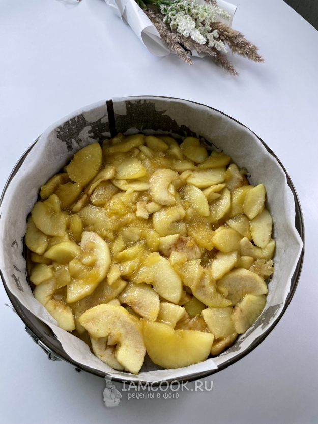 Застилаем форму пергаментной бумагой и перекладываем яблоки.