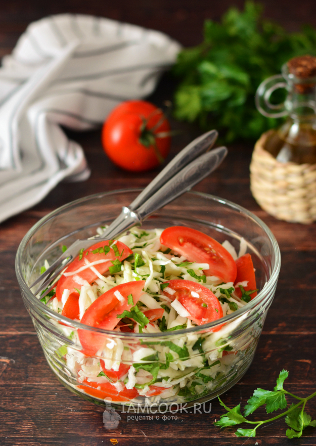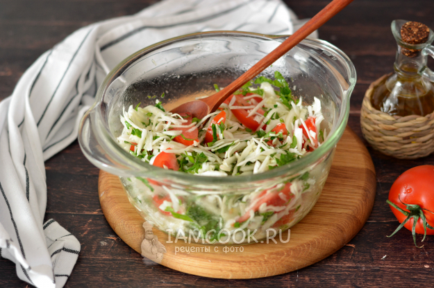 Салат из капусты и помидоров с маслом готов. Подавать его нужно сразу же.