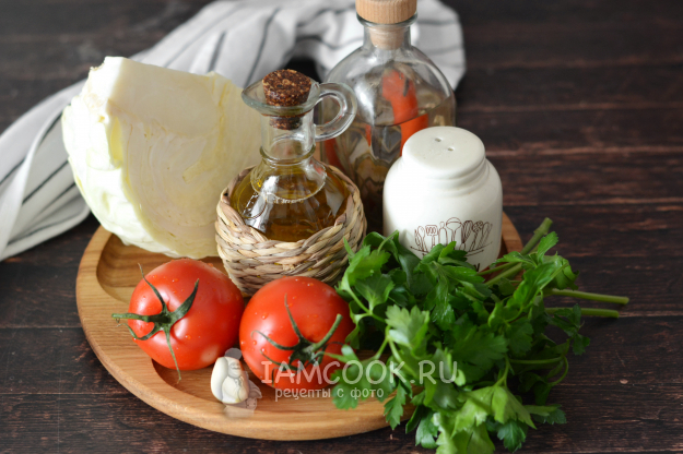 Соберите всё необходимое для приготовления салата из капусты и помидоров с маслом. Вымойте и обсушите овощи и зелень.