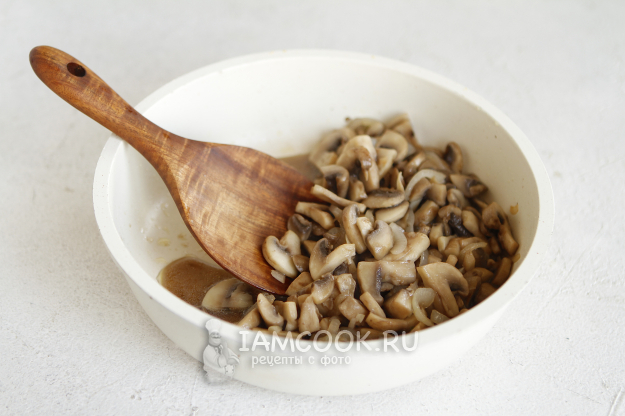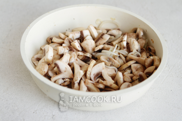Разогрейте сковороду с маслом. Для приготовления блюда я использовала смесь оливкового масла и топленого. На среднем огне обжарьте лук до мягкости. Добавьте шампиньоны и продолжите обжаривать грибы вместе с луком.