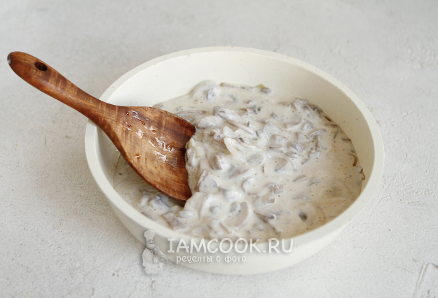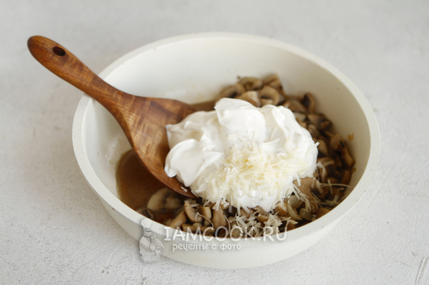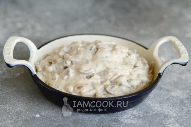 В глубокую миску влейте сливки, добавьте сыр, специи, перемешайте. Влейте сливки к грибам и доведите их до кипения. Как только сливки закипят, убавьте огонь и готовьте шампиньоны в сливках с сыром на сковороде под крышкой 8-10 минут.