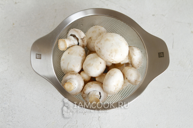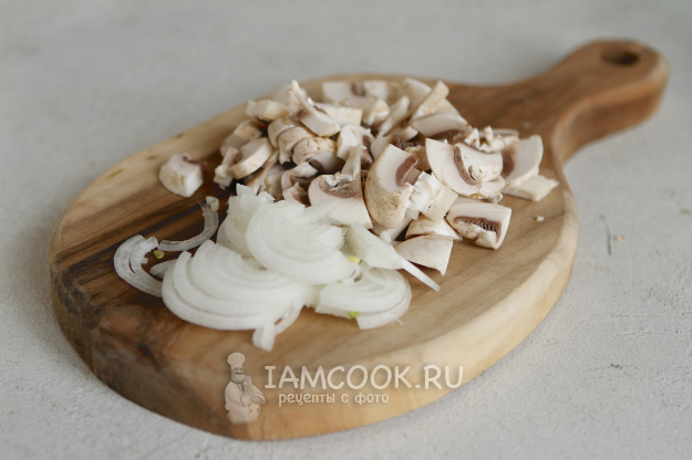 Срежьте потемневшие участки с шапки грибов. Нарежьте грибы на слайсы одинакового размера. Одну небольшую головку репчатого лука почистите и нарежьте полукольцами.