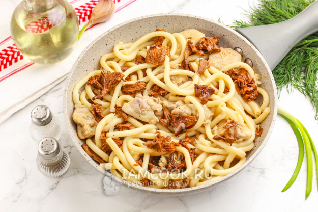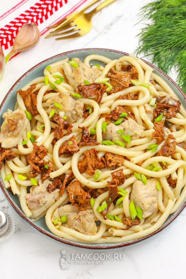 Выложите пасту с лисичками и курицей на тарелки. Промойте и измельчите зеленый лук, любую другую свежую зелень и присыпьте сверху. Подавайте с любым соусом.