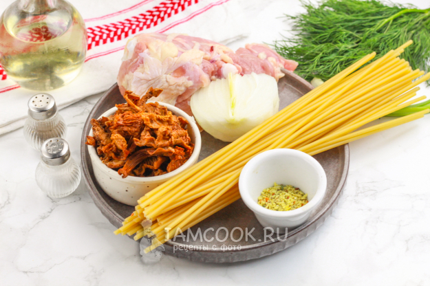 Продукты для приготовления пасты с лисичками и курицей - перед вами!
