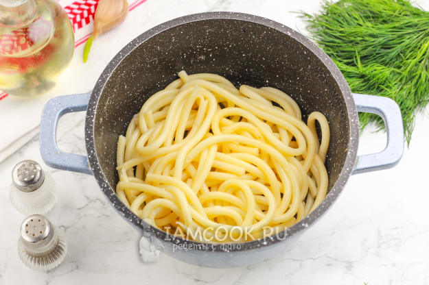 Прежде всего отварите пасту в подсоленной кипящей воде. Время варки указано на упаковке пасты. Слейте жидкость и сбрызните пасту маслом, слегка перемешайте. В бульоне не оставляйте, так как она разбухнет.