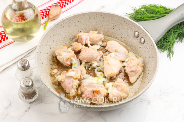 Пока паста варится, промойте часть тушки в воде, срежьте мякоть и нарежьте порционными кусочками. Нарежьте полукольцами половинку луковицы и обжарьте на сковороде с растительным маслом 4-5 минут, добавляя и кусочки курицы.
